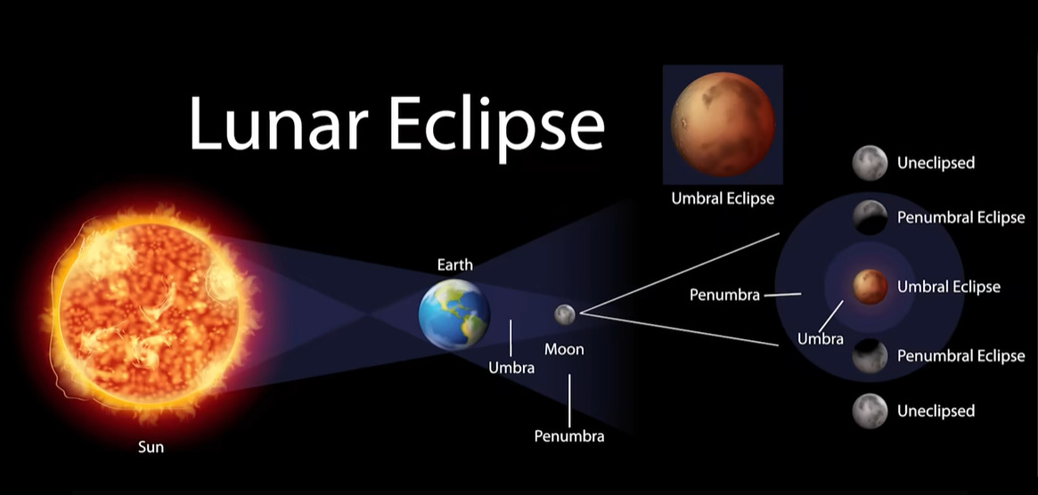 Celestial Alignment: For a total lunar eclipse, the Sun, Earth, and Moon must align perfectly, with Earth sitting between the Sun and Moon. Earth casts two shadows into space: