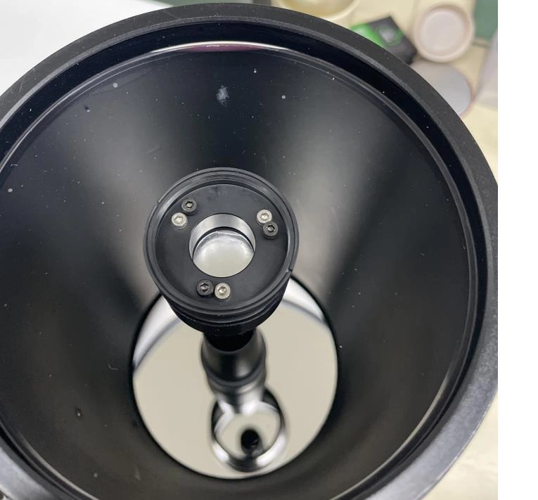 Exposing the Adjustment Mechanism: Unscrew the metal cap at the front of the telescope counterclockwise to expose the internal secondary mirror (correction mirror) and its three pairs of adjustment screws.