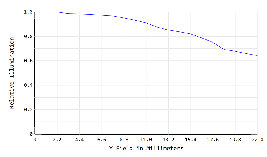 This graph shows the relative brightness distribution from the center to the edge of the image. The gradual dropoff and high brightness maintained even at the edges effectively control vignetting.
