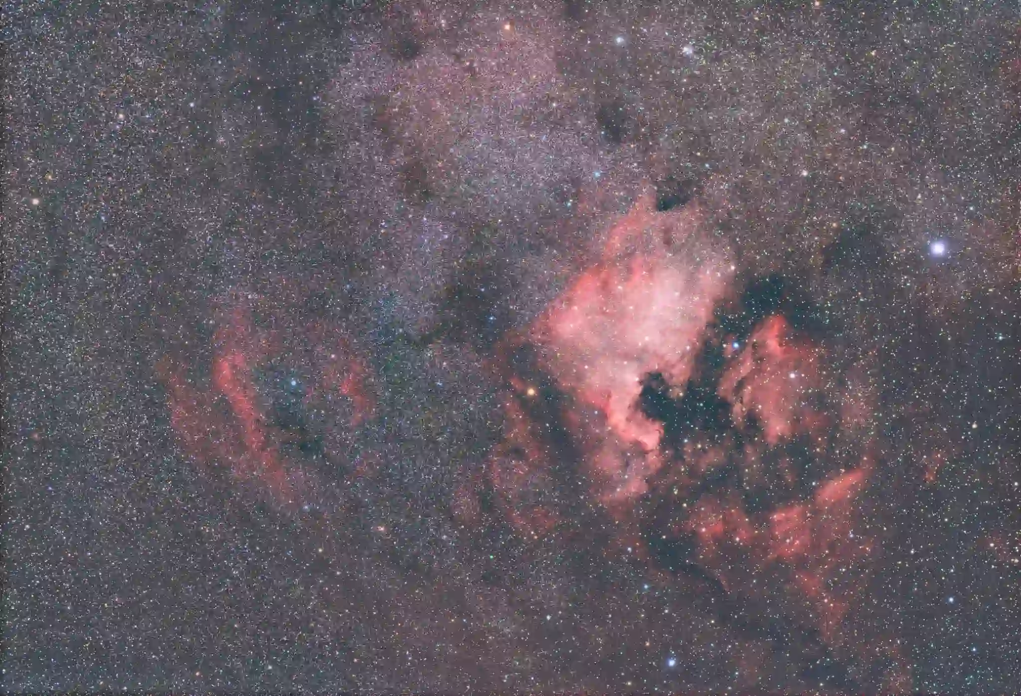 - Sufficiently wide field of view: Easily captures large subjects such as the Orion Nebula (M42) and its surrounding Barnard's Loop, the combination of the North American Nebula (NGC7000) and the Pelican Nebula (IC5070), and the dense star fields of the Milky Way.