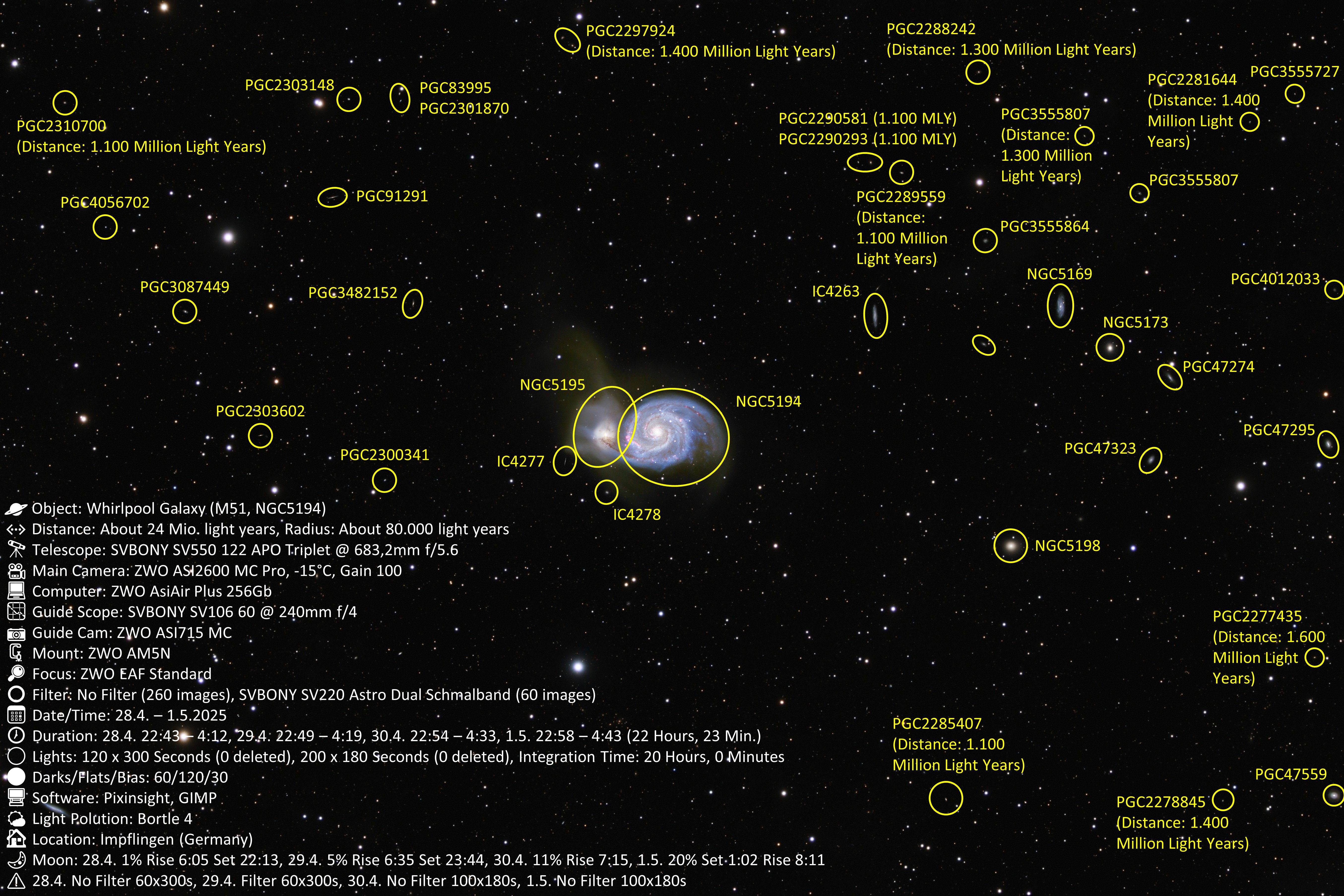 At the end of April 2025, my daughter and I photographed the Whirlpool Galaxy M51. Our goal, once again, was to push the SV550 122mm telescope to its limits. This resulted not only in this image of two colliding galaxies, but also in the detection of several other galaxies up to 2 billion light-years away. Detailed descriptions can be found in the third and fourth images. Once again, our large telescope has demonstrated the capabilities of SVBONY products, and I wholeheartedly recommend them to every astronomy enthusiast.