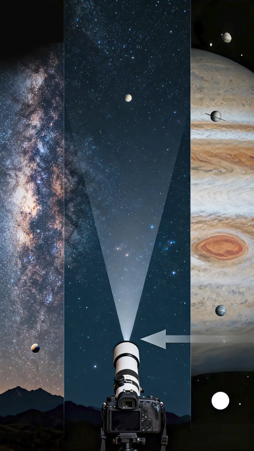 Focal length determines image scale. Planetary observation requires long focal-length systems, often extended with Barlow lenses to achieve the effective focal length needed for a sufficiently large image on the sensor.