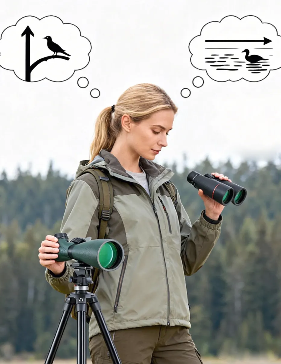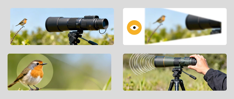 Higher magnification lets you see distant details clearly but narrows the field of view. It also causes more shake when handheld, so you usually need a tripod for stability.