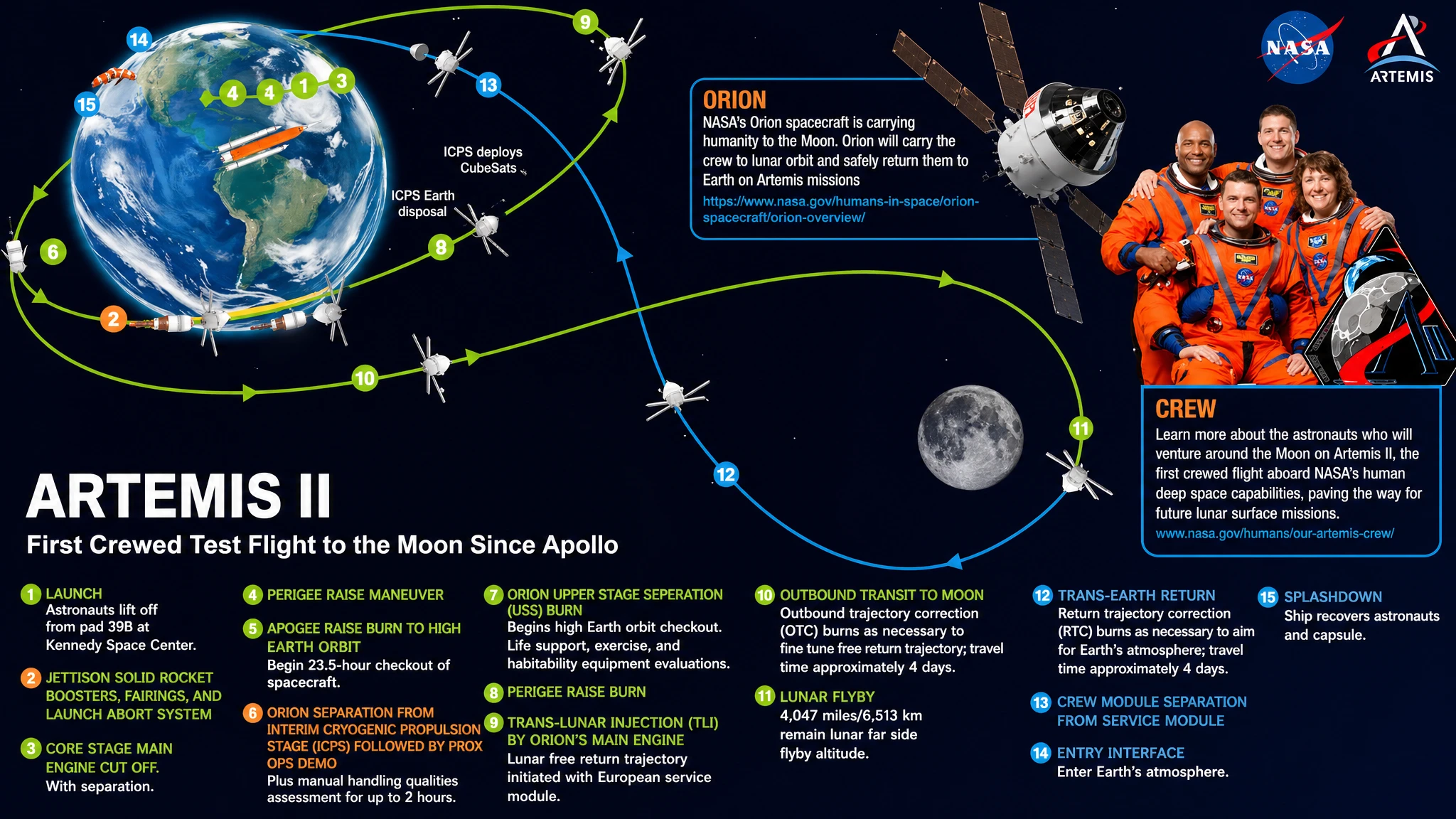Artemis II, NASA's first crewed lunar mission since Apollo, launches no earlier than late 2024/early 2025. The Orion capsule 'Integrity' will carry four astronauts on a 10-day trip around the Moon, going farther into deep space than ever before.