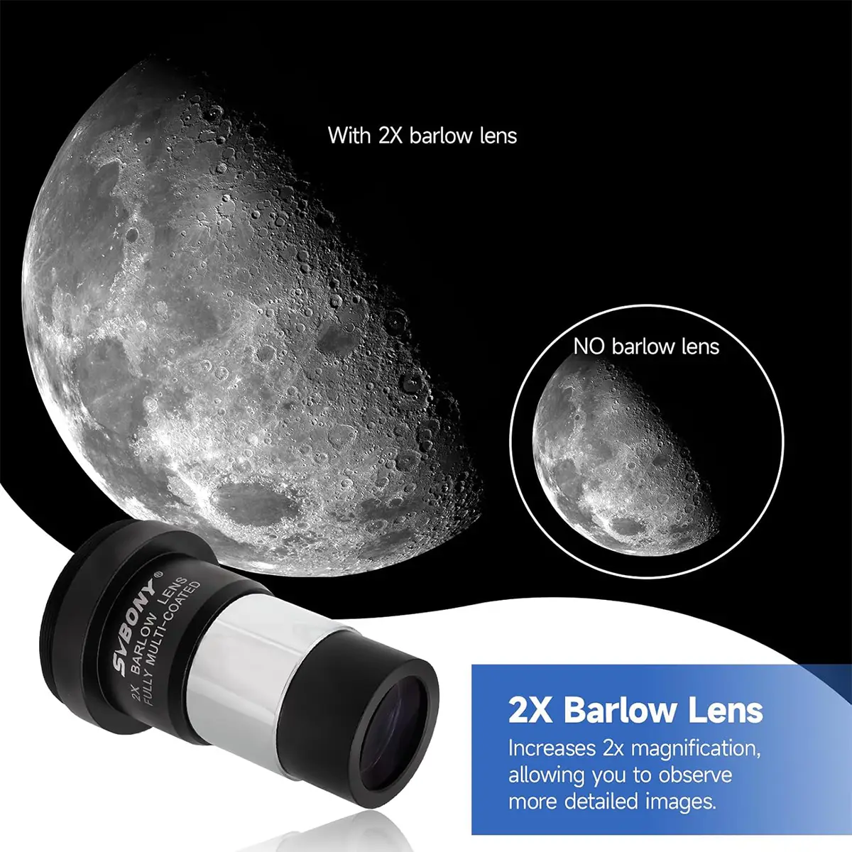 This eyepiece kits include two plossl 6mm & 17mm eyepieces, a 2x barlow len, three 1.25inch telescope filters. The optics feature fully multi-coated as well as 1.25inch interface. This telescope accessory kit is designed for visual observation.