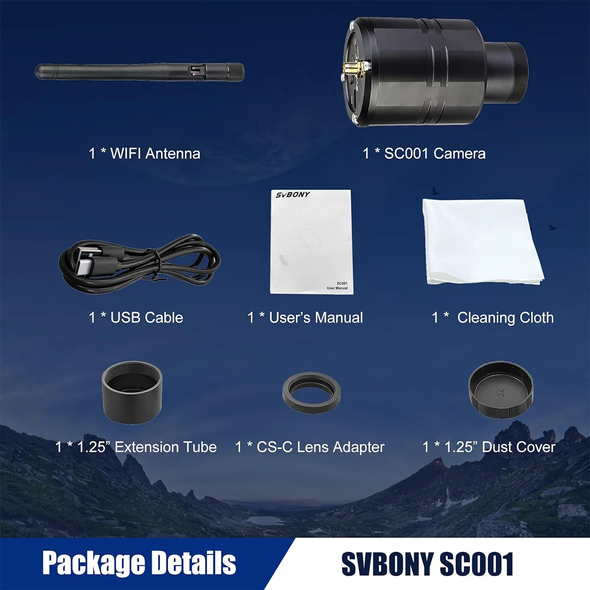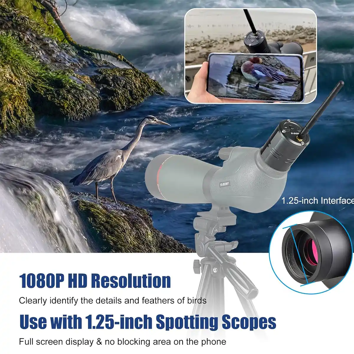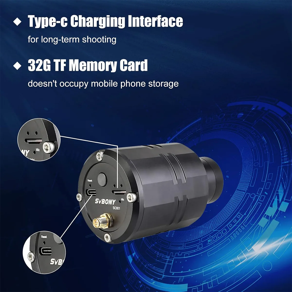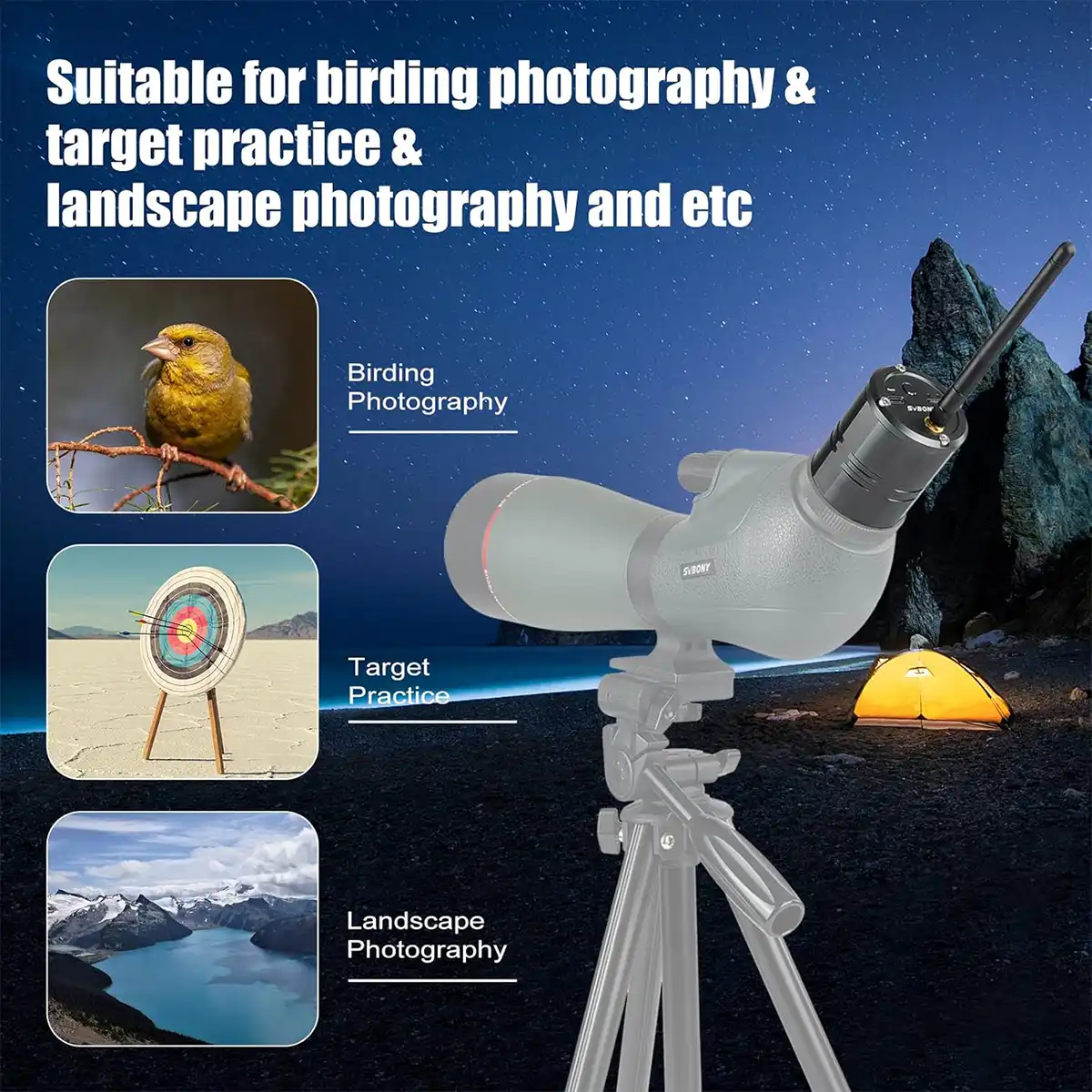 Svbony SC001 is a WiFi electronic camera for spotting scopes, with generates wifi hotspot, It could be connected with mobile phone via APP, people could capture photos and video on the APP directly, and share to social media asap. The photos or videos file could be saved to the TF card included, and downloaded to the mobile phone, more convenient to edit on a mobile phone and share with your friends.(SC001WiFi camera supports Android and iPhone.)