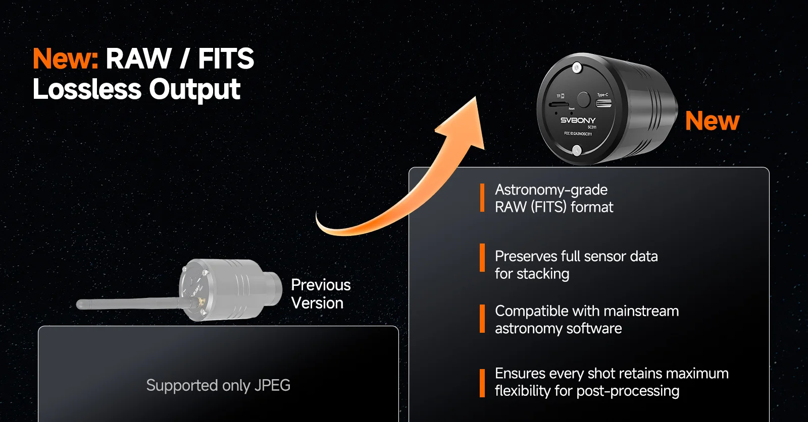 A: The new SC311 PRO has been completely redesigned from the ground up. It introduces key astronomical imaging enhancements, including 30-second long exposure optimized for nebulae and galaxies, and the ability to save 12-bit RAW image data in FITS format.