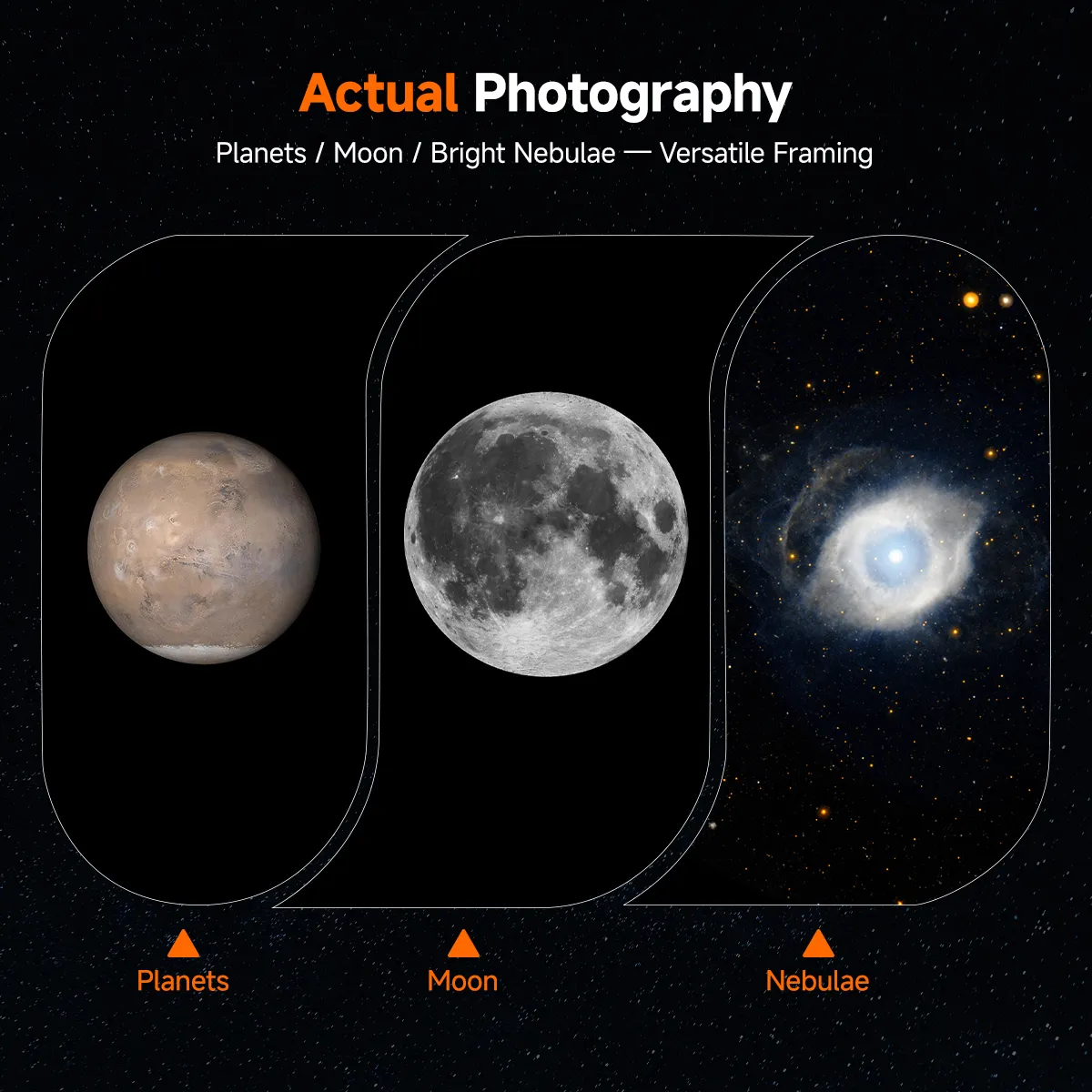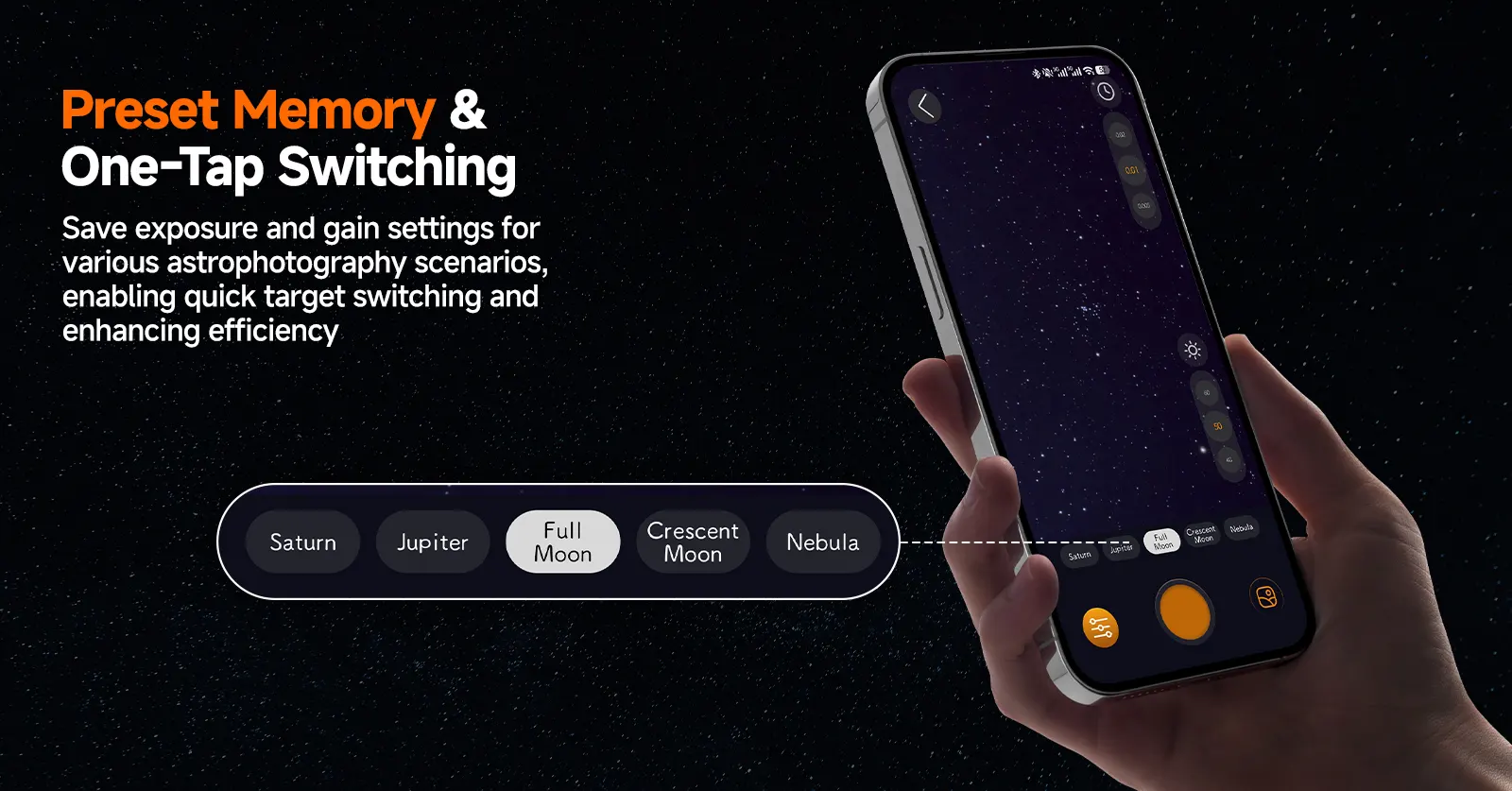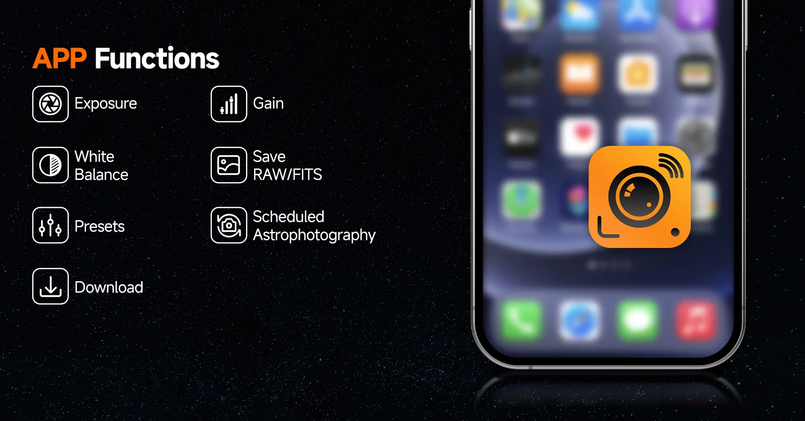- FITS format support: Users can import captured FITS images into a computer for post-processing.(Note: FITS format images are currently only saved on the memory card. The pictures stored on the phone are in JPEG format.)