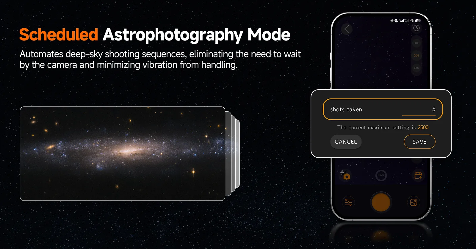 - Scheduled shooting: Enables timed shooting sequences for automatic continuous exposure, ideal for extended observation sessions.