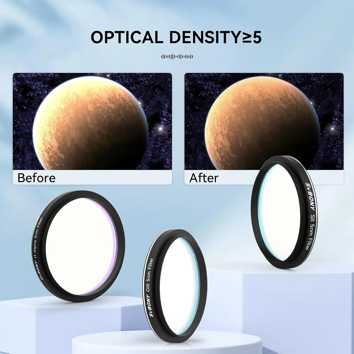 - 3. The Oxygen III 5nm Extra Narrowband Filter transmits a 5nm bandwidth of light that is centered at 500nm and drastically reduces other transmissions, including wavelengths of light that are responsible for light pollution (both artificial and natural). Like all SVBONY filters that are designated as “CCD”, this OIII also blocks infrared wavelengths from 700nm to 1100nm so you don't need a separate IR-Cut filter.