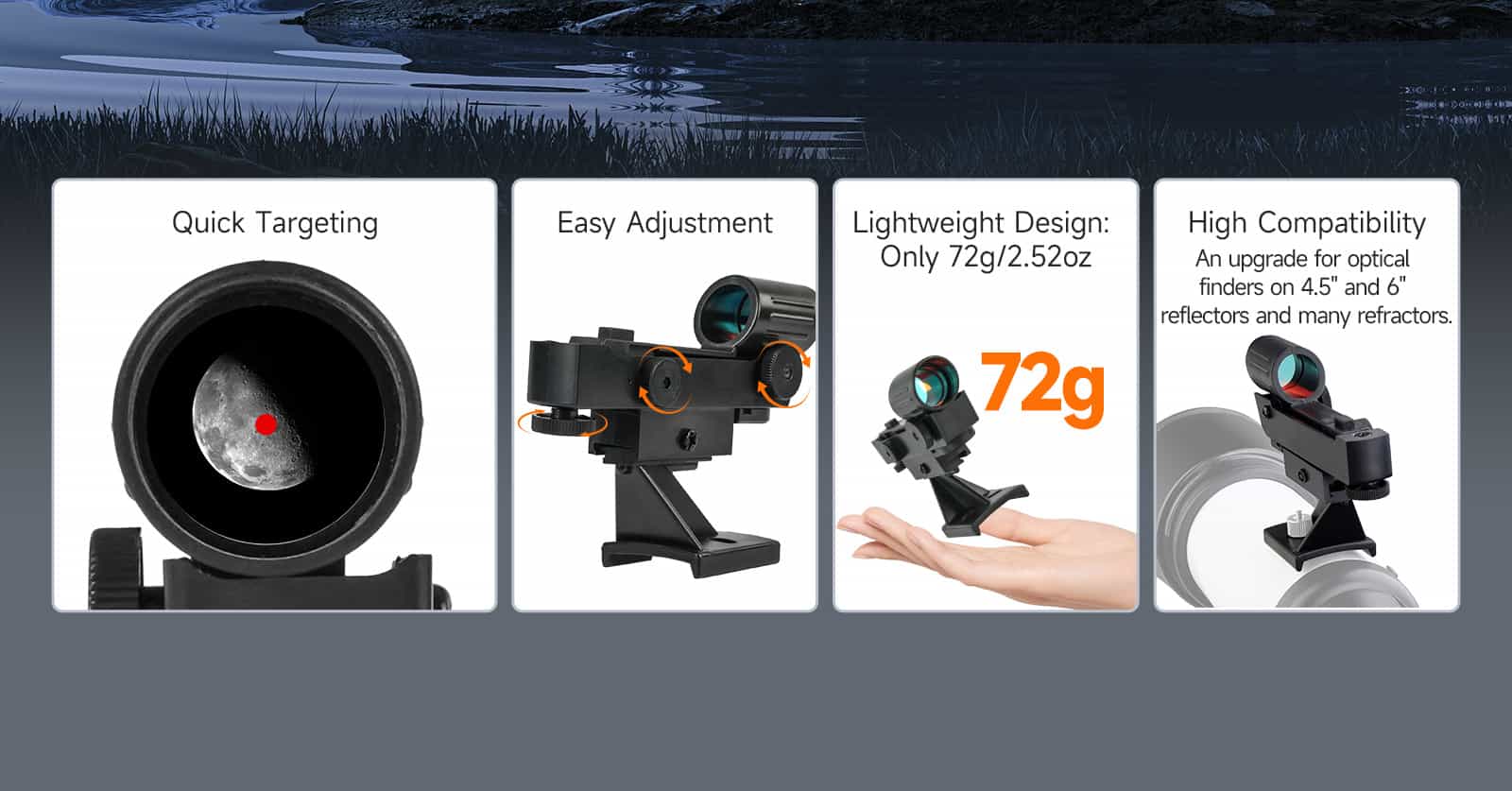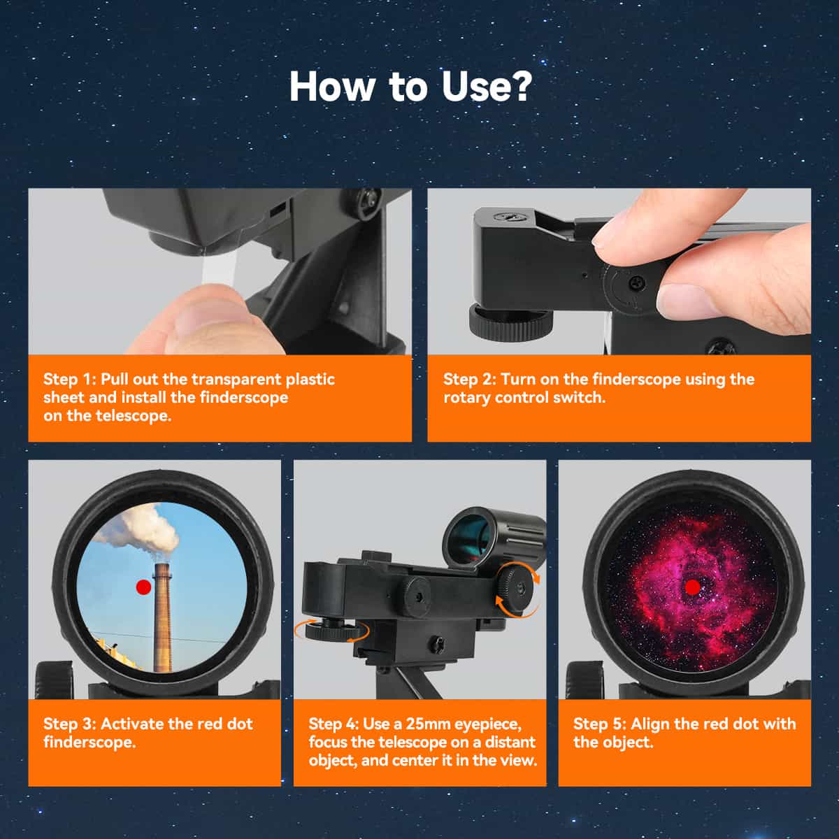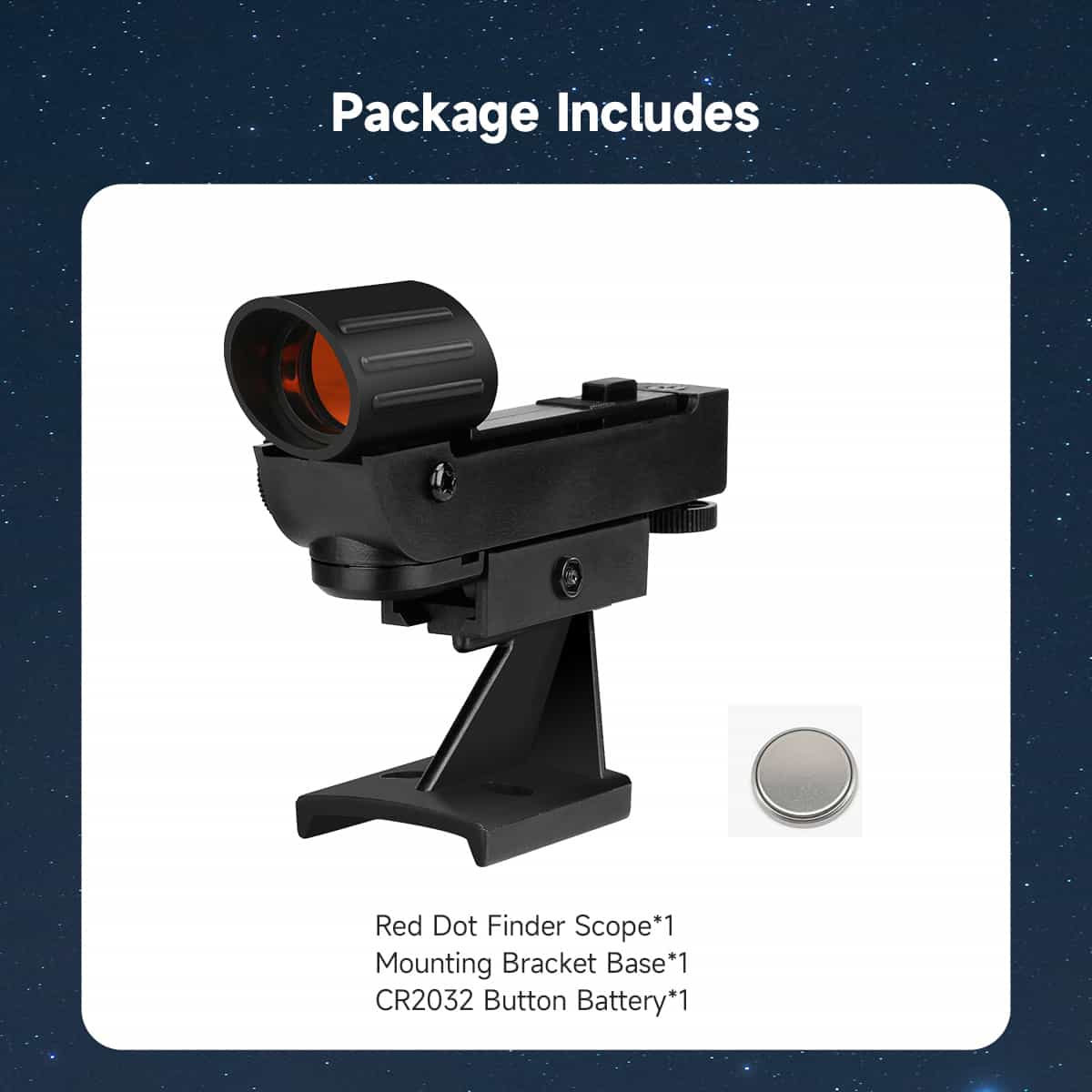 | Note | Main be fit for Celestron 80EQ SE SLT PS Series and Meade Infinity and Polaris and so on Series Astronomical Telescope (Note: Meade Infinity Series:80AZ 90AZ 102AZ and Polaris Series: 80EQ 90EQ not applicable) | This Red Dot Finder Scope for CELESTRON 80EQ 80DX 90DX SE SLT OMNI Series and so on Astronomical Telescopes |