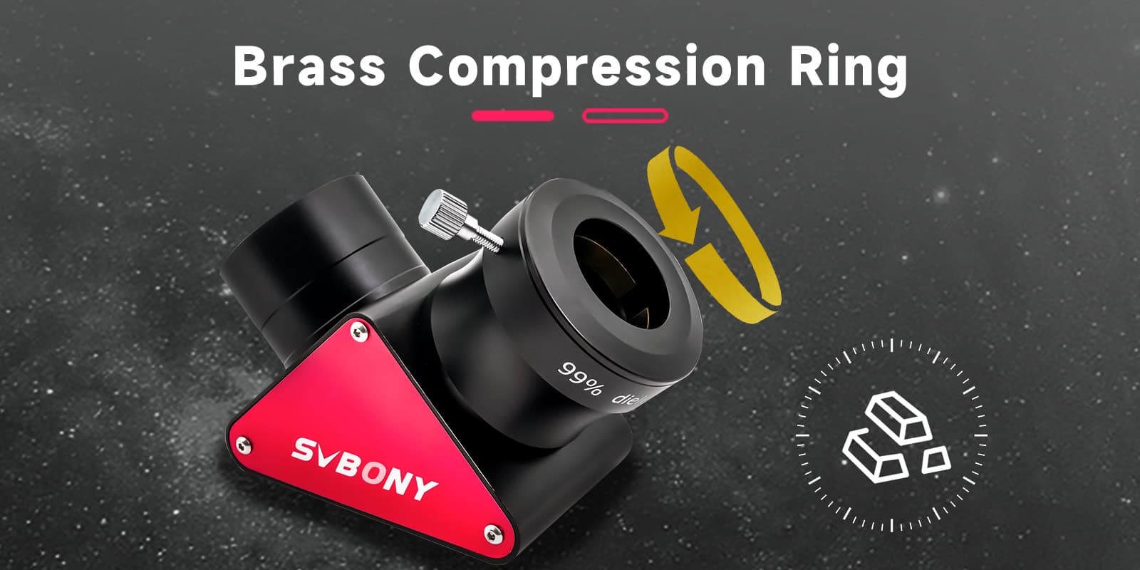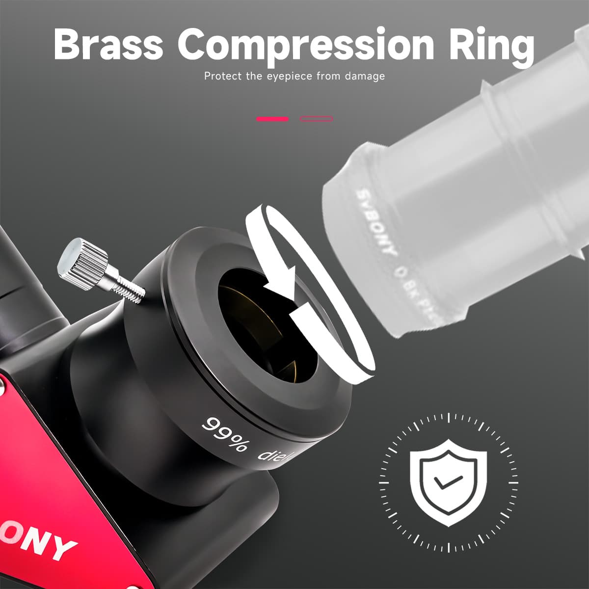 - Brass compression ring; Built in brass ring and thumbscrew accessories avoid eyepiece to rotate during adjustments; effortless fixes more firmly and will not scratch your eyepieces barrels.