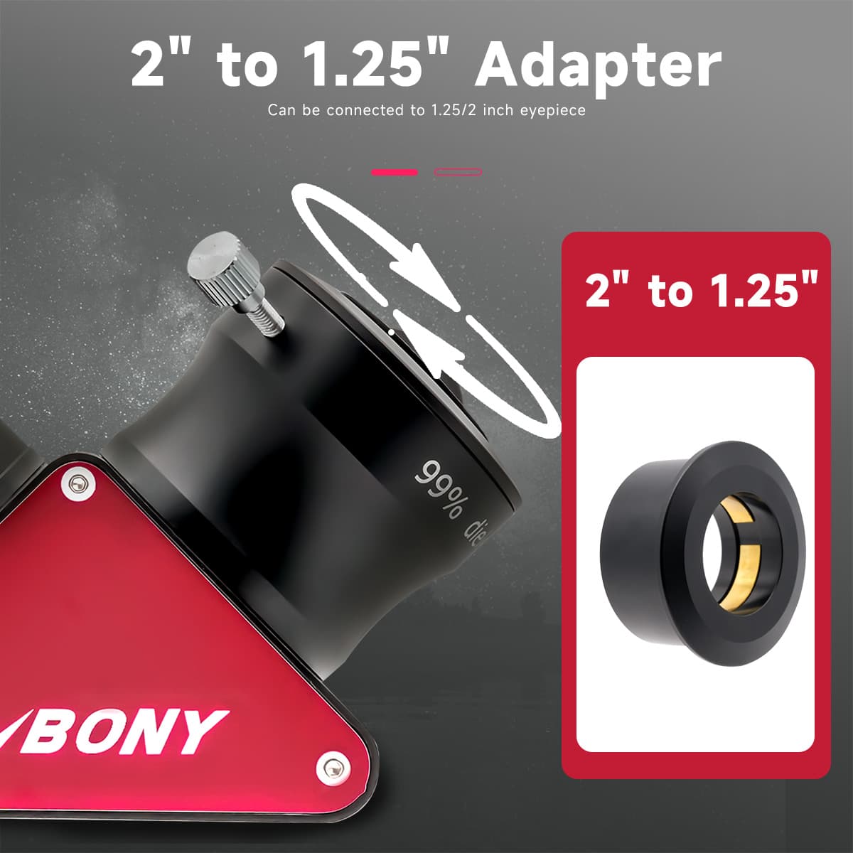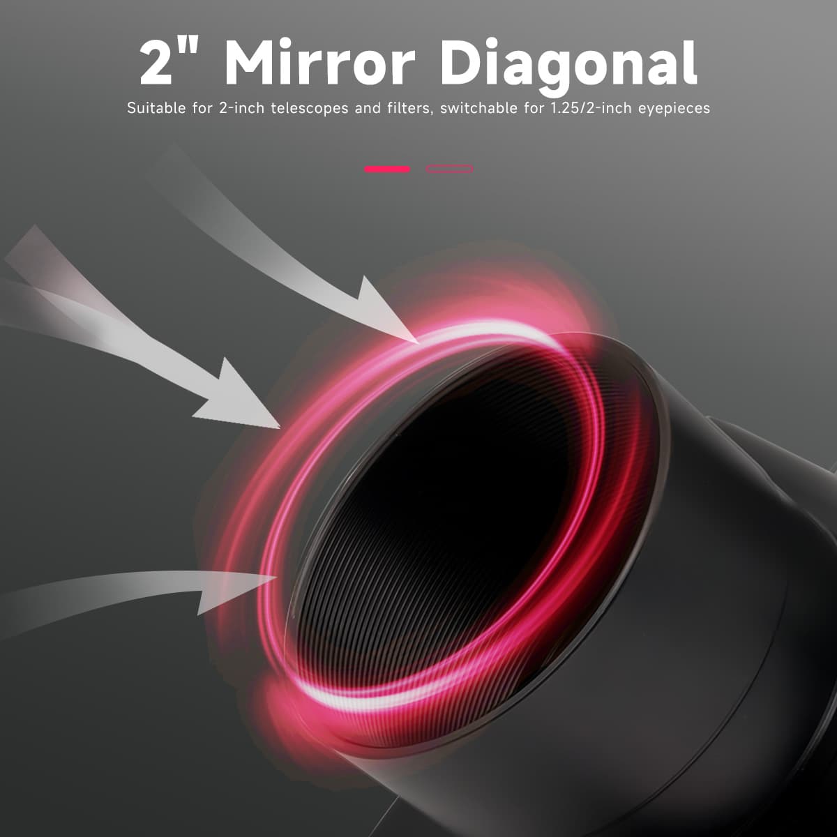 - The 1.25-inch nosepiece fits 1.25-inch telescopes and accepts standard 1.25-inch filters, eyepieces, Barlow lenses, and similar accessories; The 2-inch nosepiece is compatible with 2-inch telescopes and accommodates standard 2-inch filters and accessories. You can choose either 1.25inch or 2inch diagonal based on your requirements;