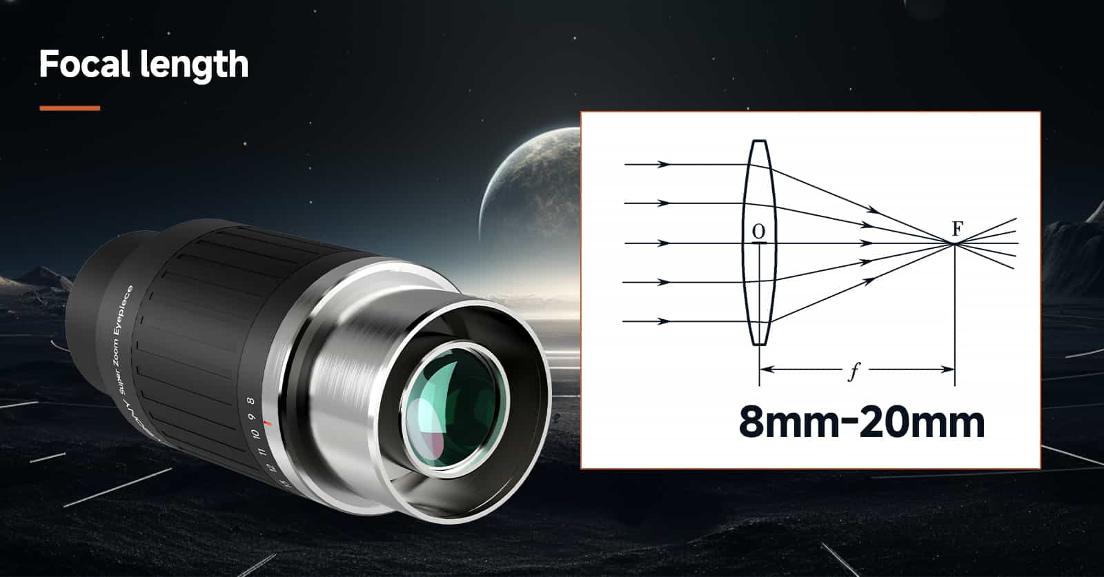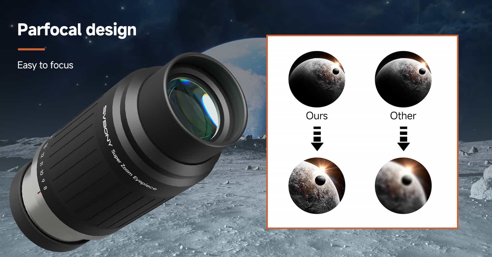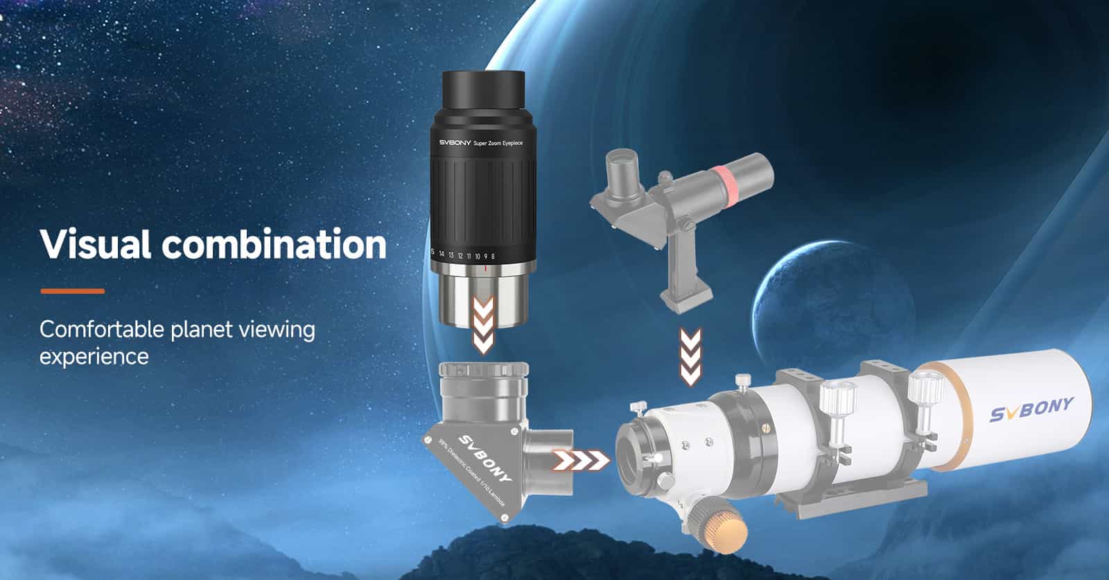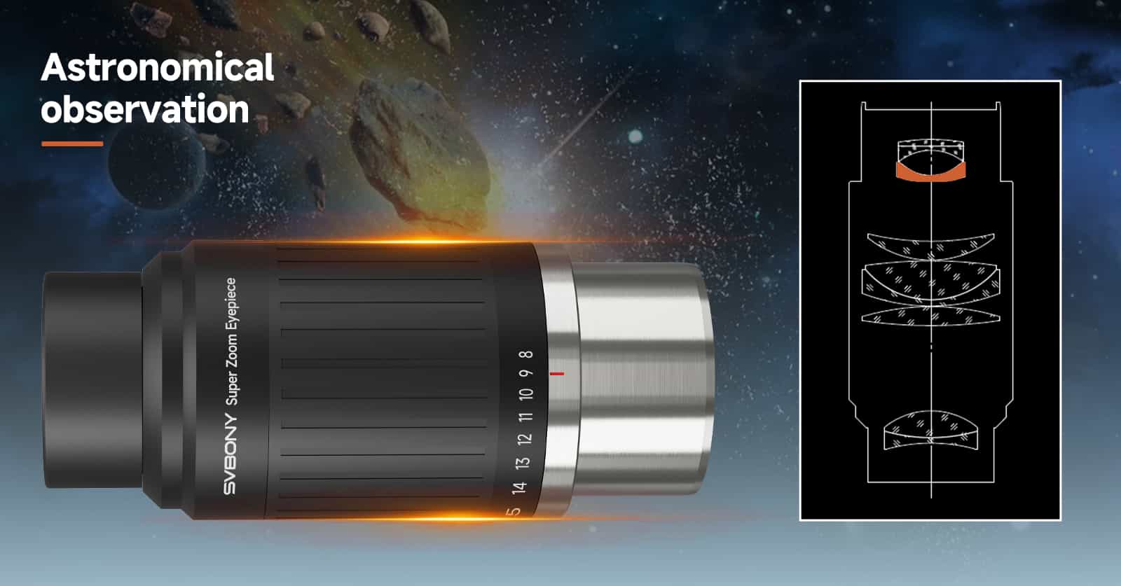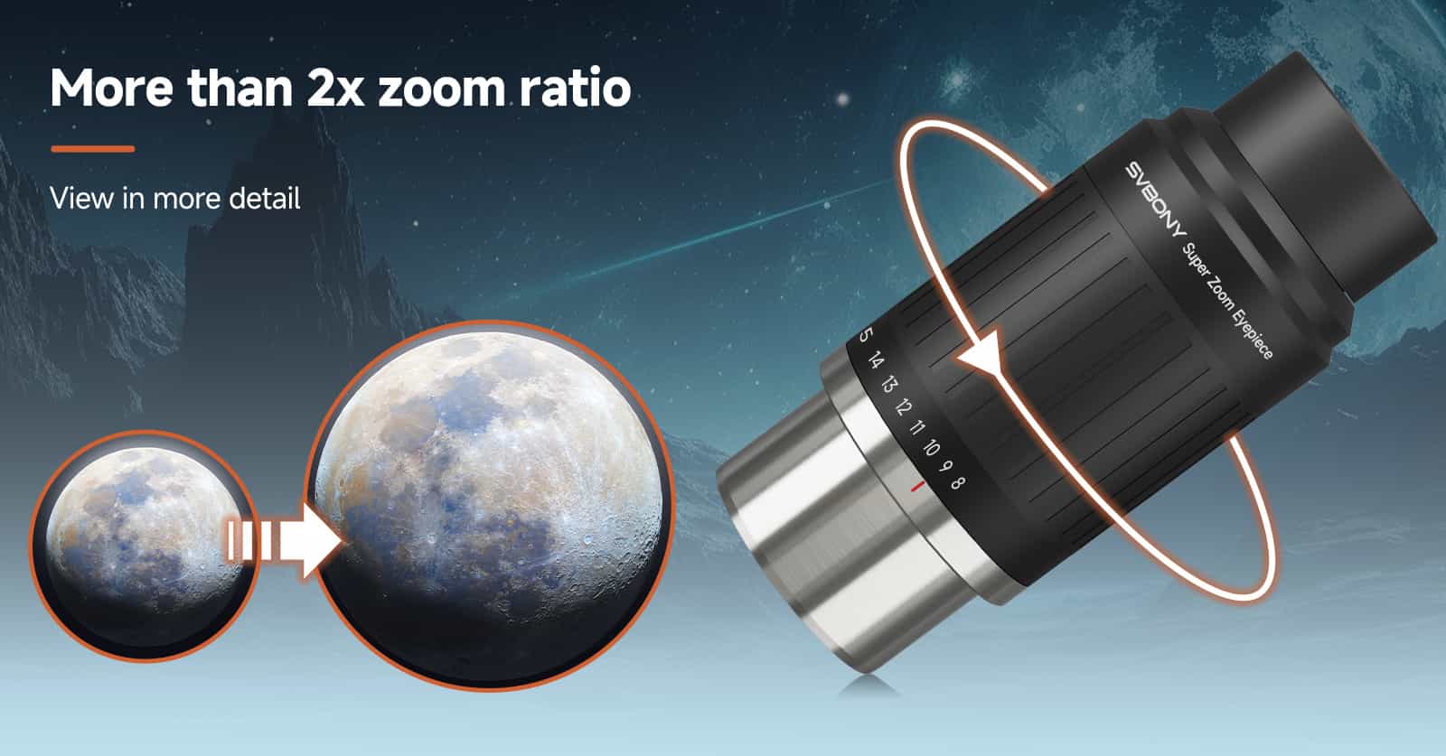 SV230 Super Zoom Aspheric Eyepiece Clickstop Parfocal Design 8-20mm 57°- 72° AFOV for Astronomical Observation with 1¼" / 2" Nosepieces