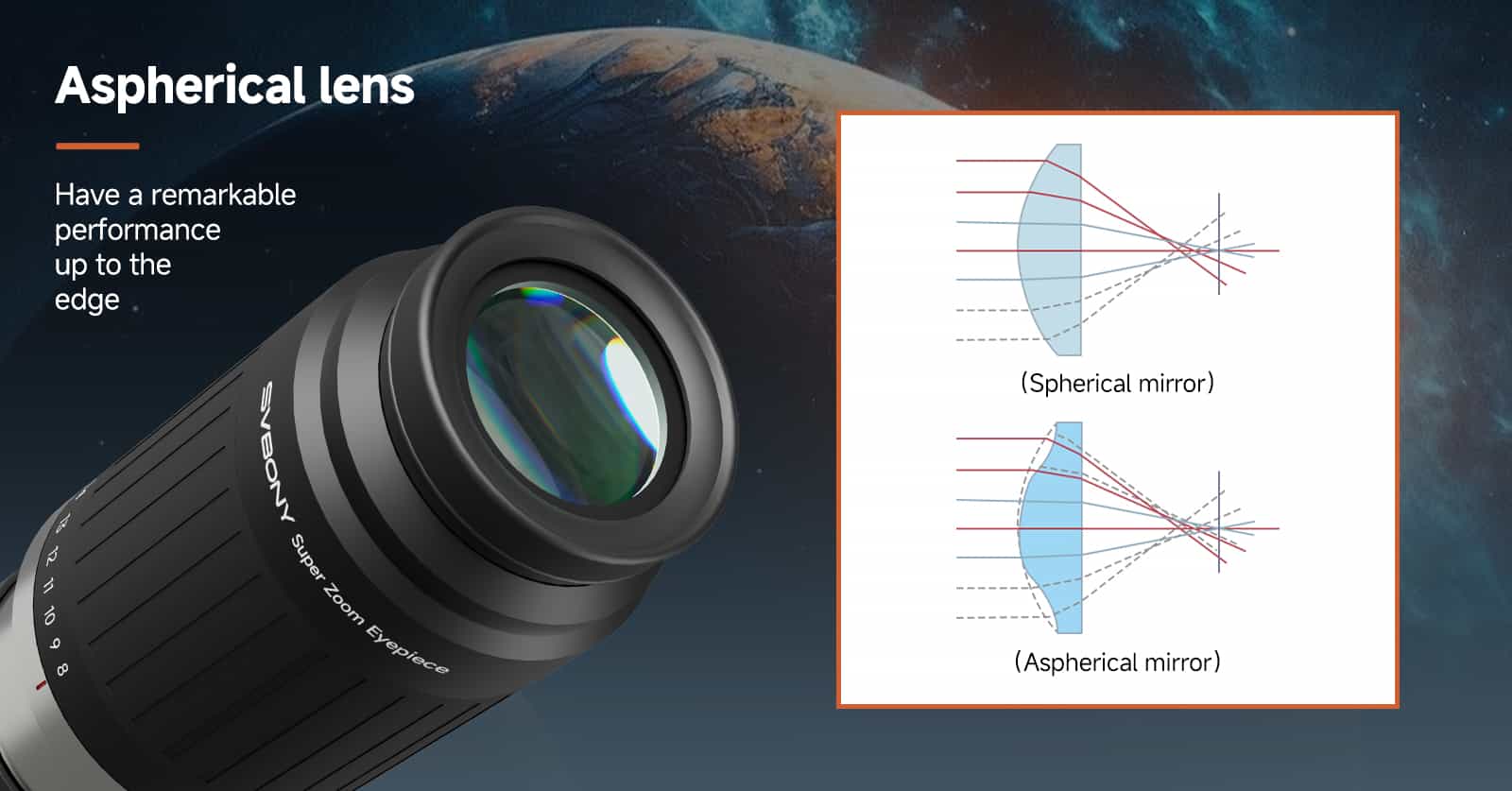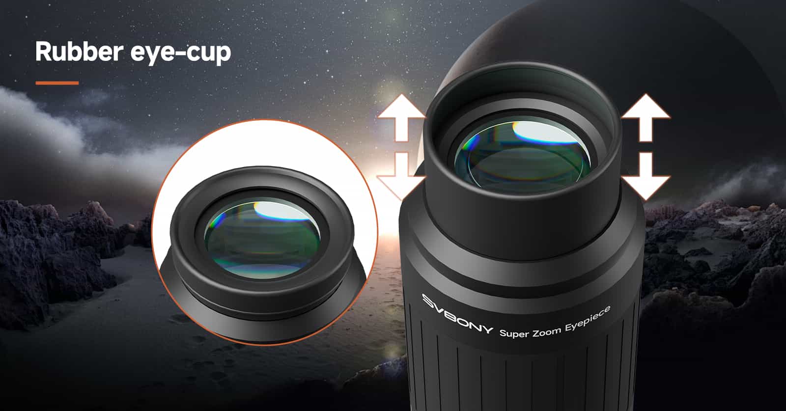 - The SV230 super zoom aspheric eyepiece is featured with clickstop click and Parfocal design, 57°-72° panoramic wide angle provides you with the ultimate observation comfort.