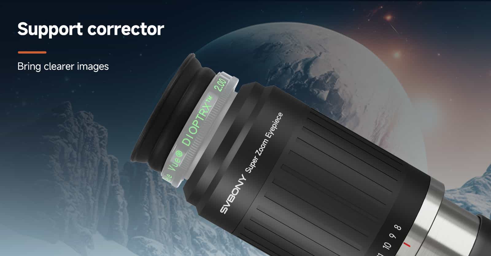 Zoom eyepiece with astigmatic corrector provides you a better visual experience. The rubber eyecup on the eyepiece can be removed. It has M43 T-mount underneath, which can be connected via an M43-T adapter(not included).