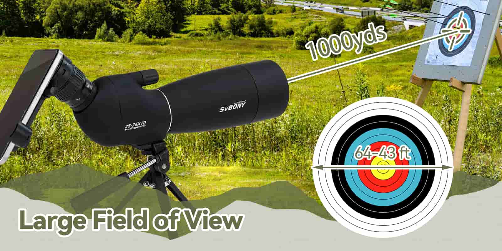 - Wide-field design: 64-43ft/1000yds expansive field of view for effortless tracking of moving targets;