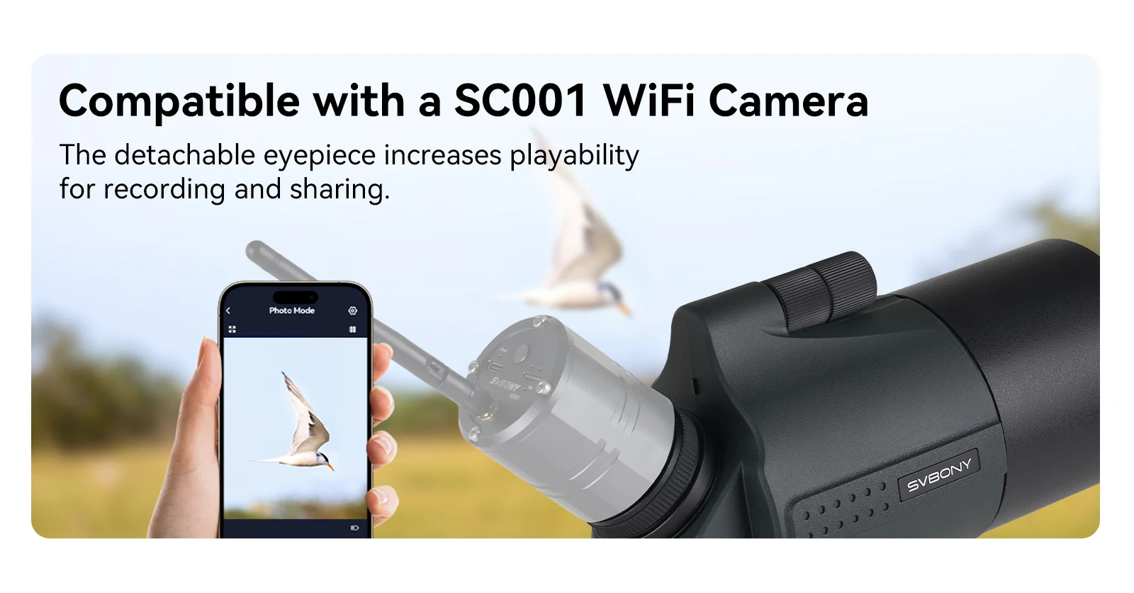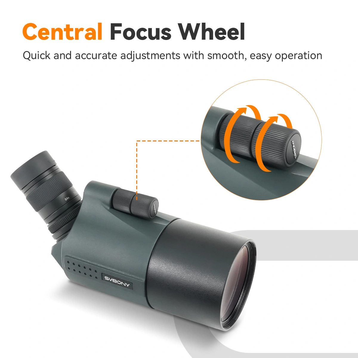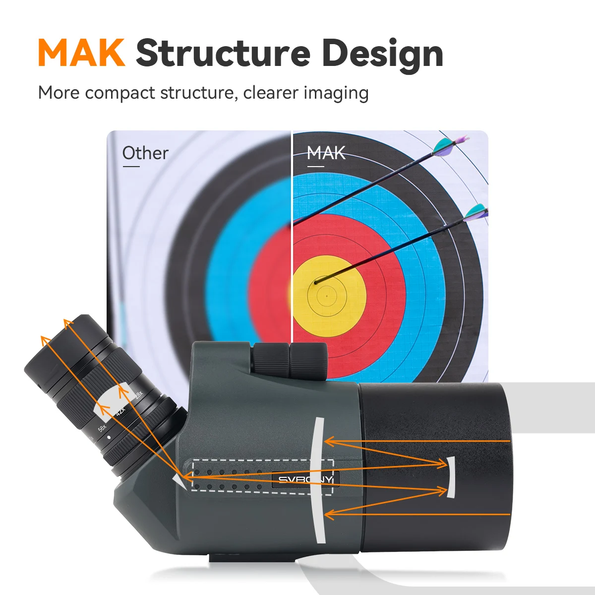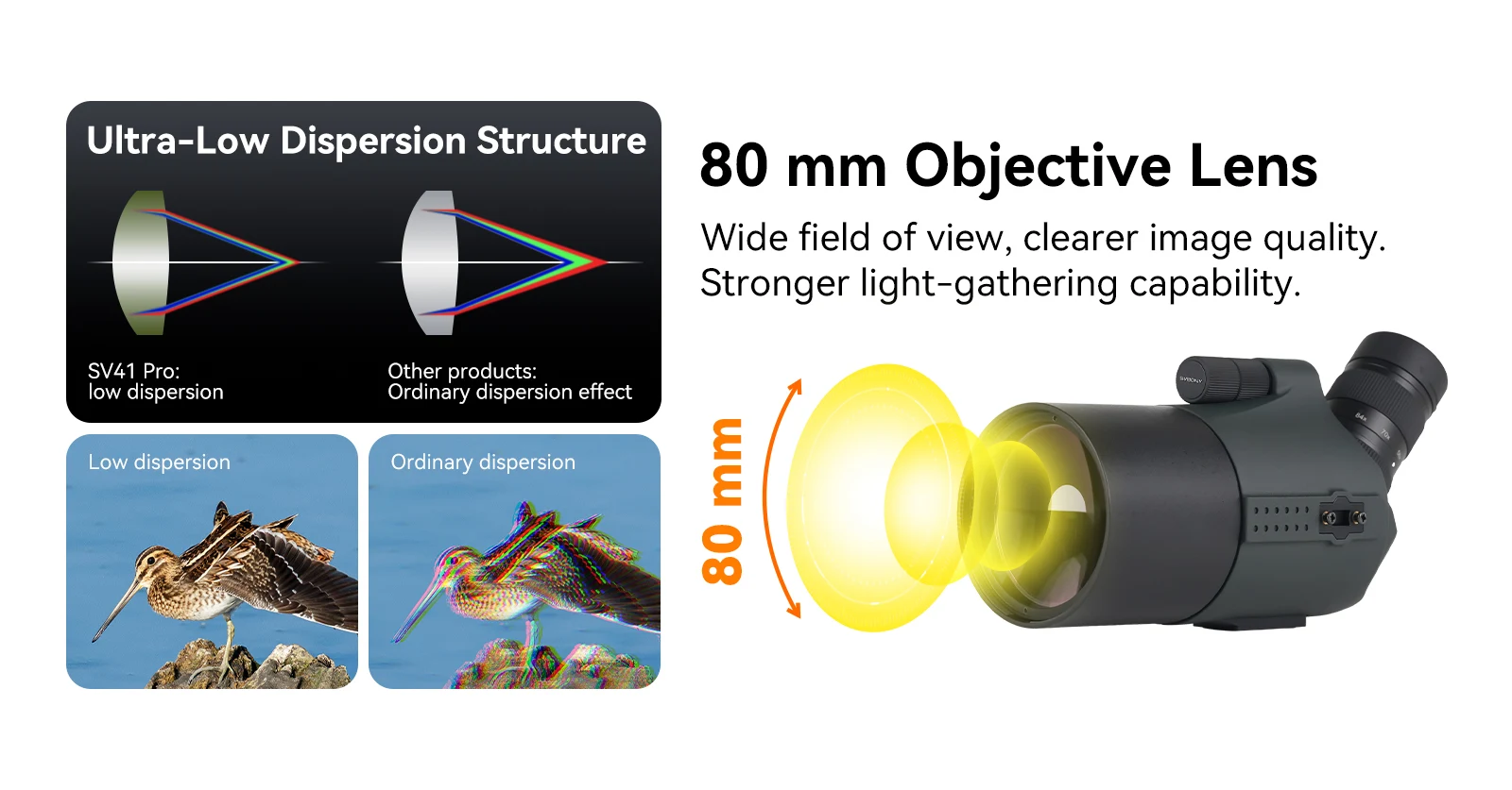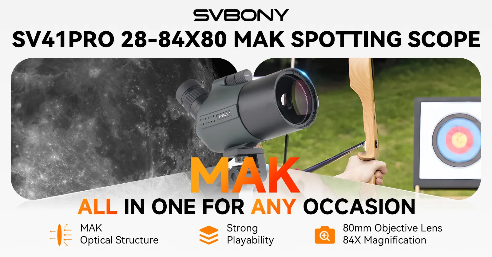 This SV41 Pro Mak spotting scope comes with more powerful magnifications, better optical performance and more accurate focusing system. The Mak design folds the spotting scope's light path, resulting in a scope that is much smaller than others of a similar focal length. Take it with you anywhere.