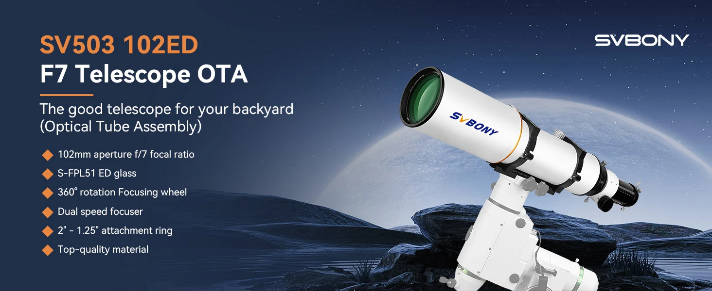 Choose between the SV503 80ED or SV503 102ED OTA, both offering high-quality optics for deep space photography, providing clear and precise imaging of galaxies, nebulae, and star clusters.