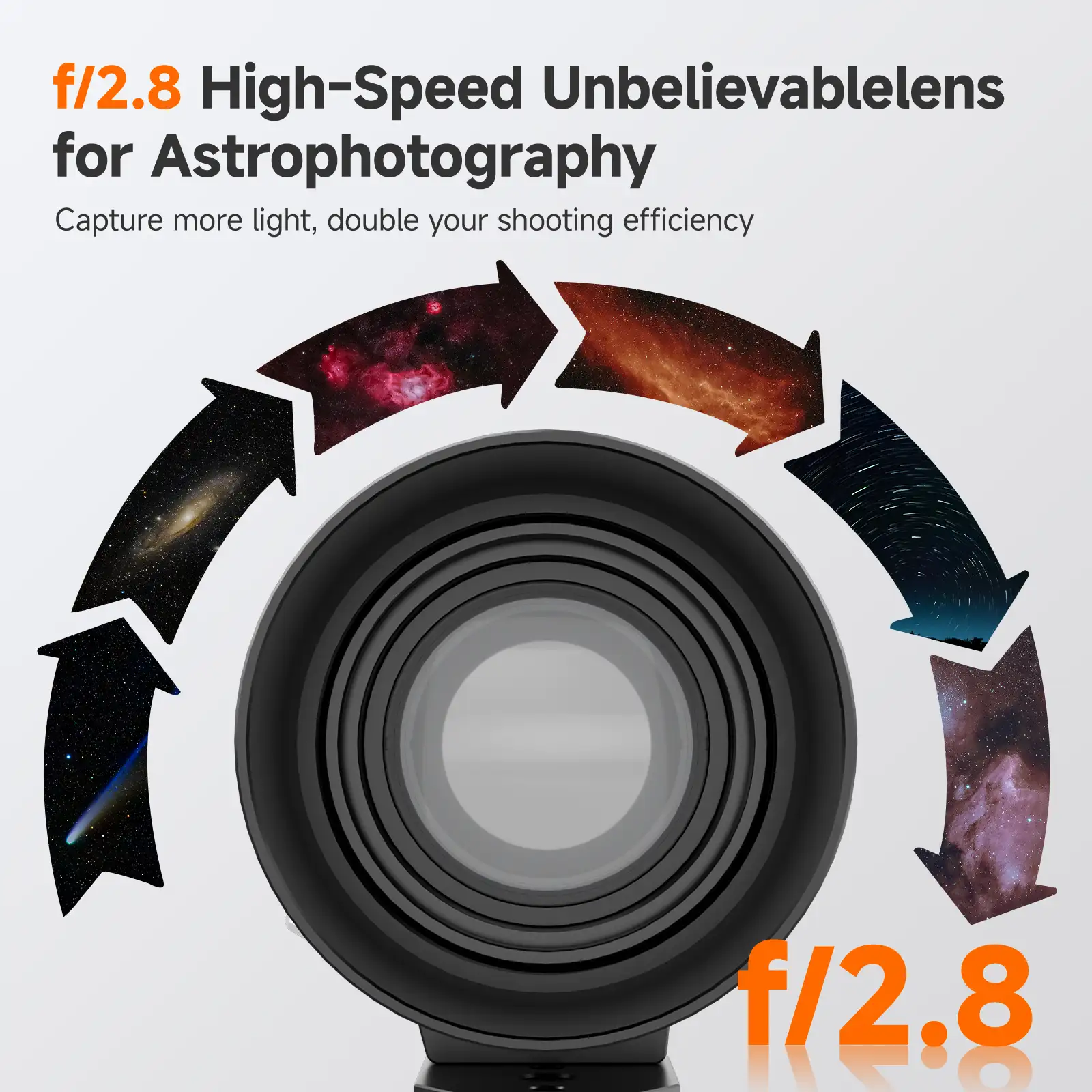 Features a large aperture F2.8 design, enabling bright and high-contrast astrophotography.