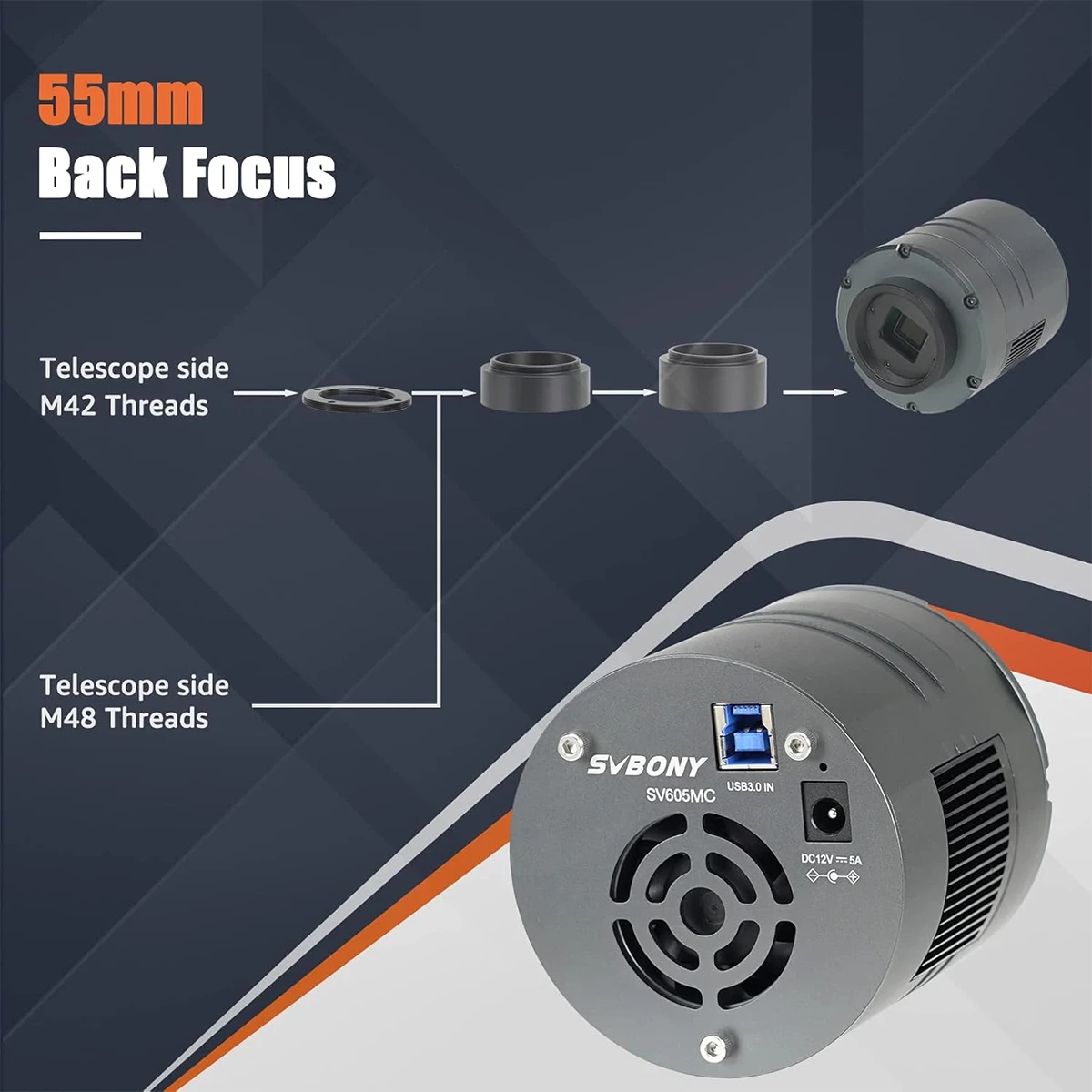 The SV605MC camera is compatible with various attachments, making it easy to integrate into your existing astrophotography setup for versatile imaging across different targets and conditions.
